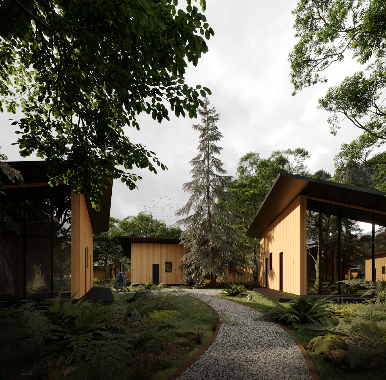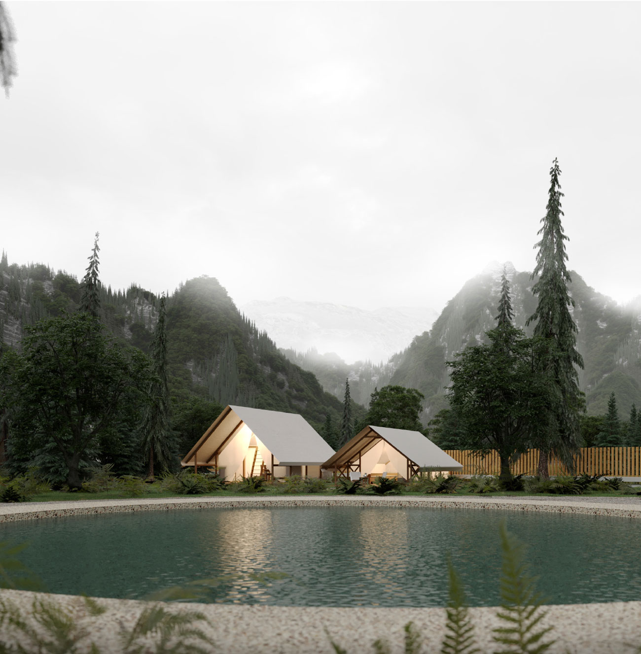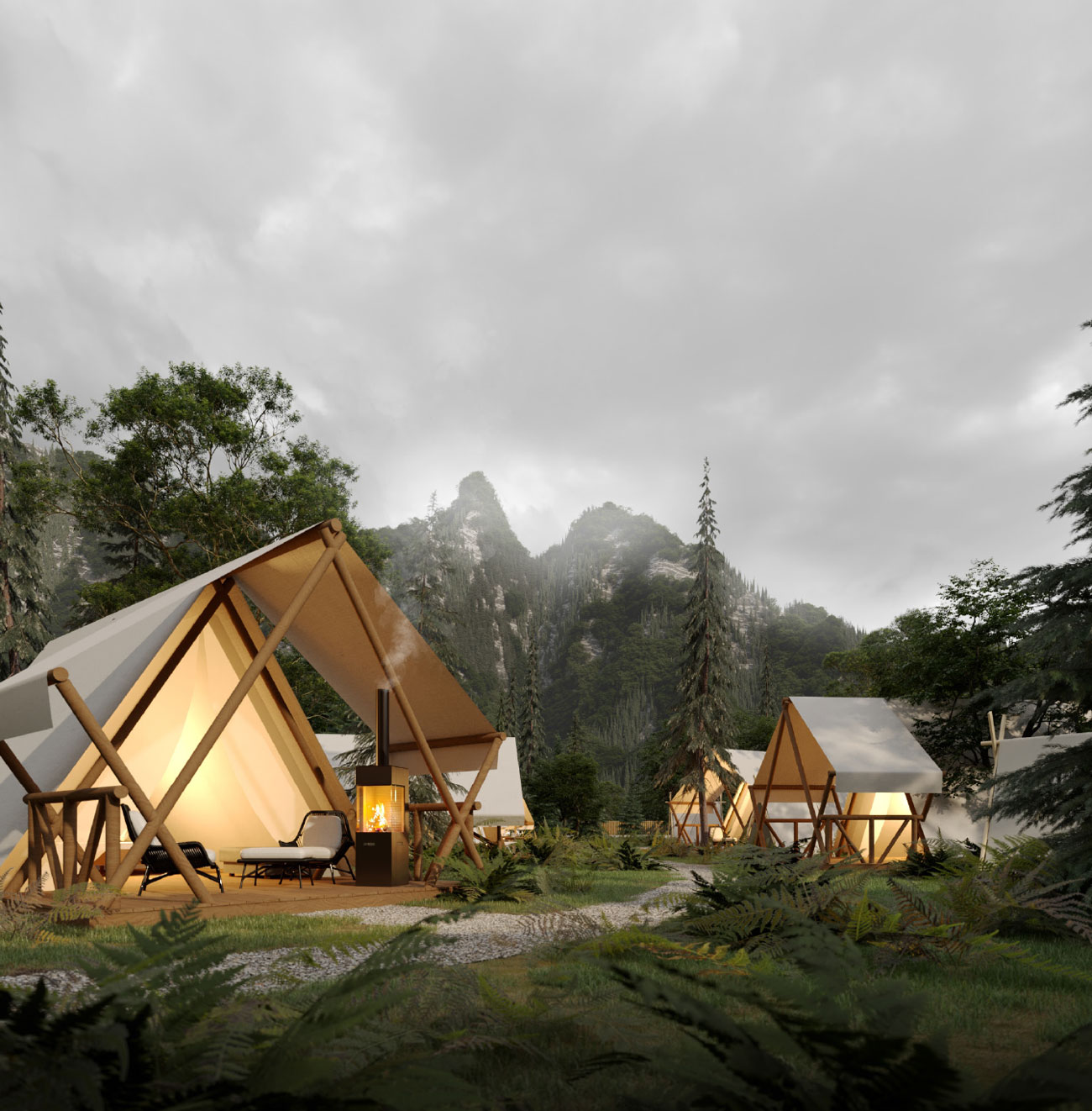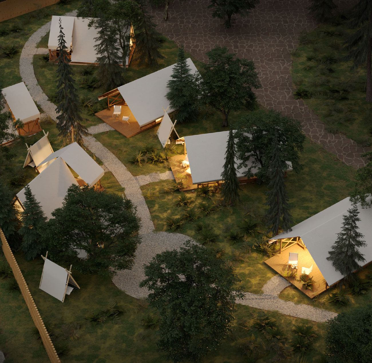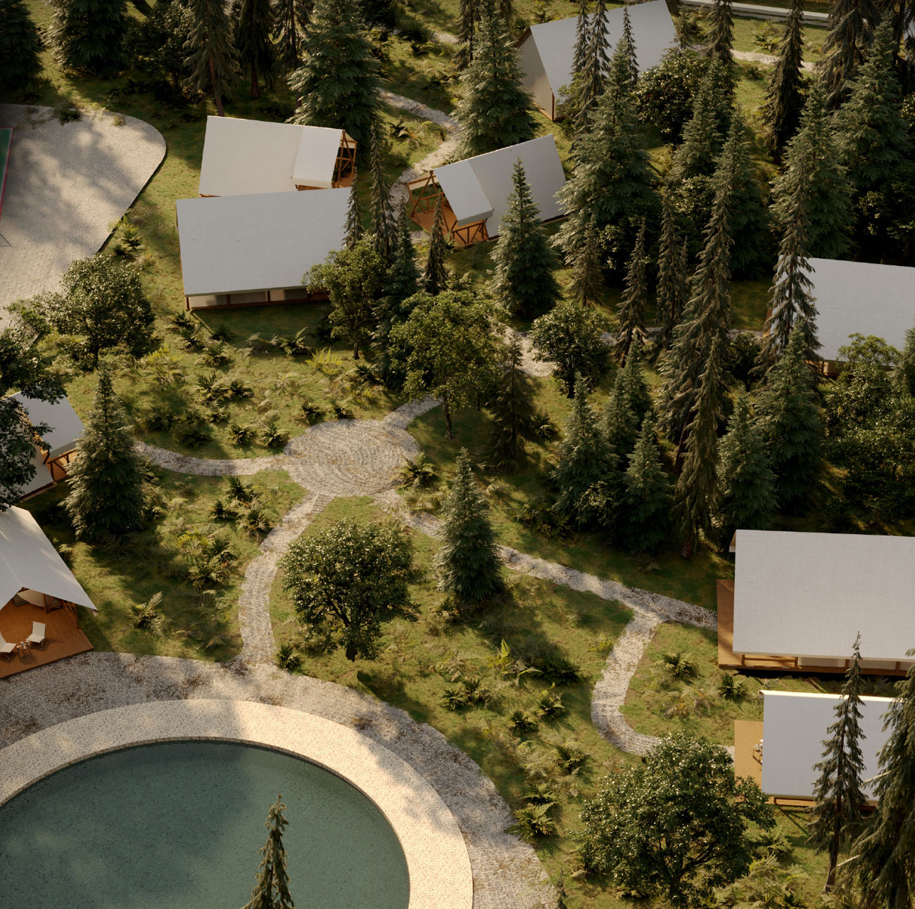 RS CONSTRUCTION & ENGINEERING has designed this project, which includes 15 individual cabins, 5 luxurious villas, a campsite hosting 15 glamping tents, restaurants, a kitchen area, a swimming pool, and a tennis court.